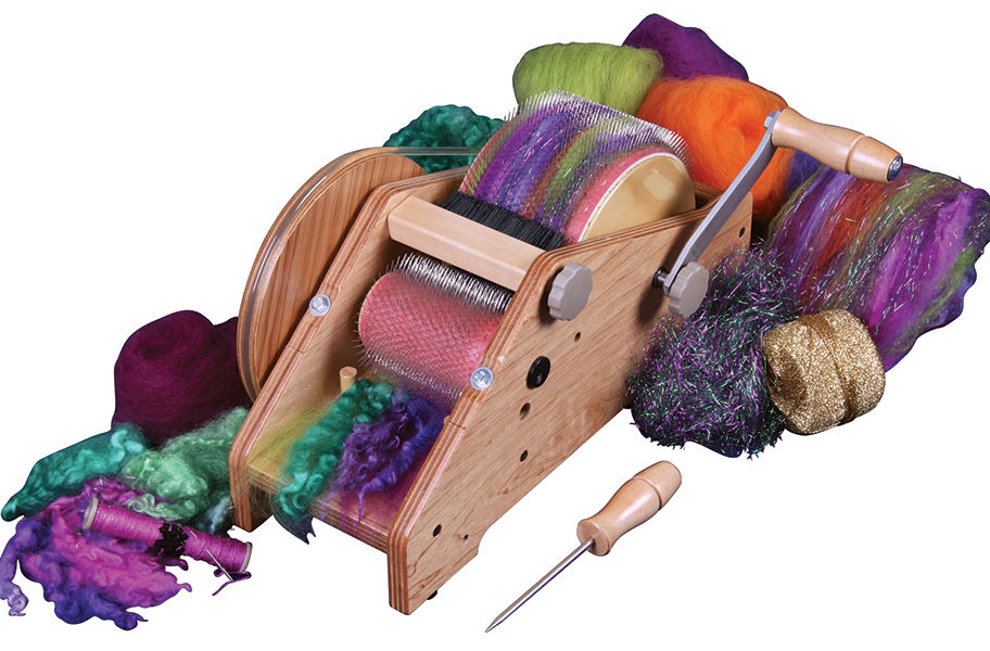 Compact drum carder perfect for smaller quantities of fibre. Features adjustable drum clearance, nylon bearings, rubber feet, wire teeth with protective coating and flexible rubber backing.